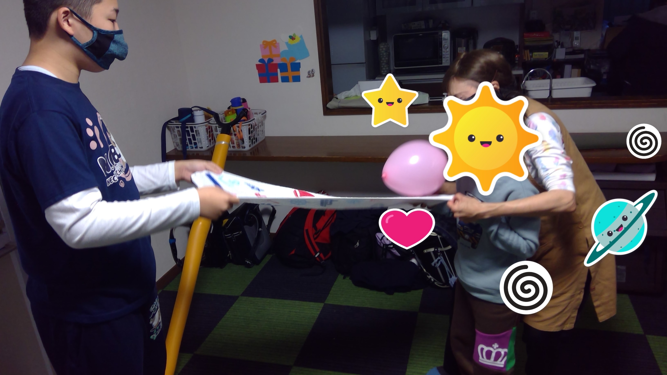 タオル風船は二人一組になってタオルを持ち、上からおろした風船をキャッチする
