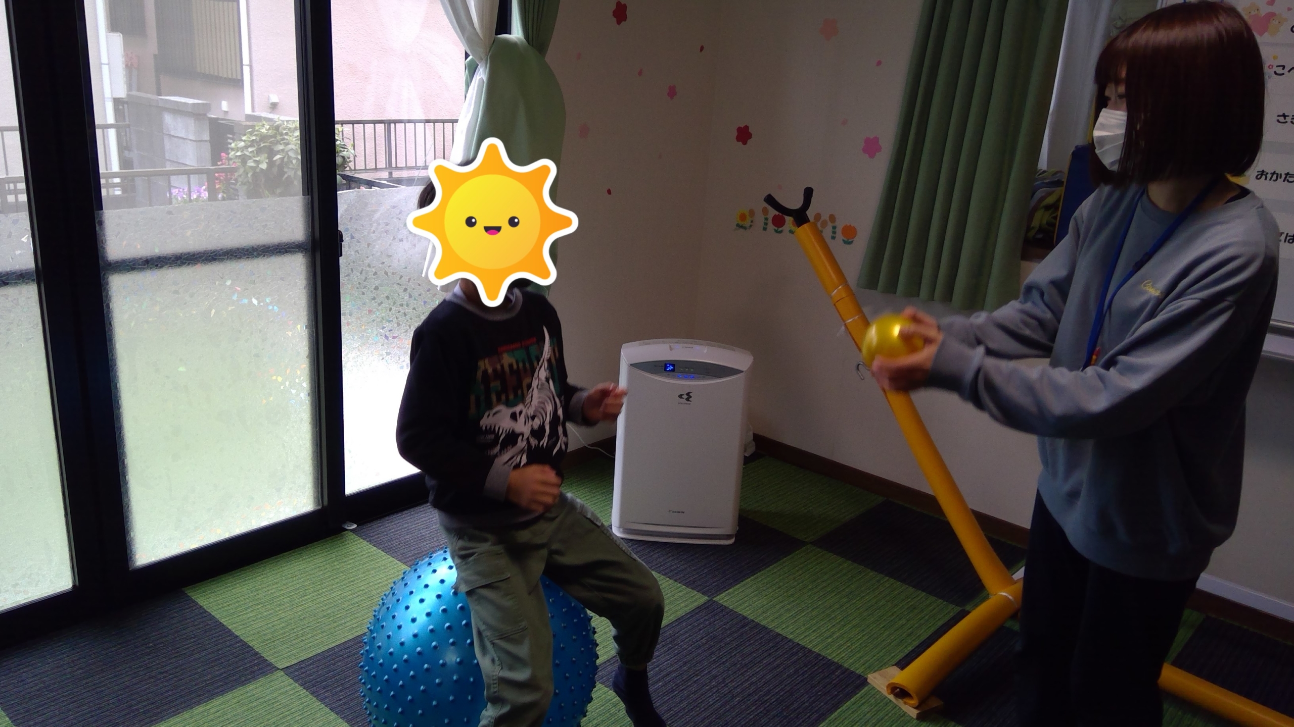 本日の集団活動は、風が強く不安定なお子様もいたため、感覚刺激が沢山入るように…バランスボール・トランポリンを使った感覚統合遊びにしました。