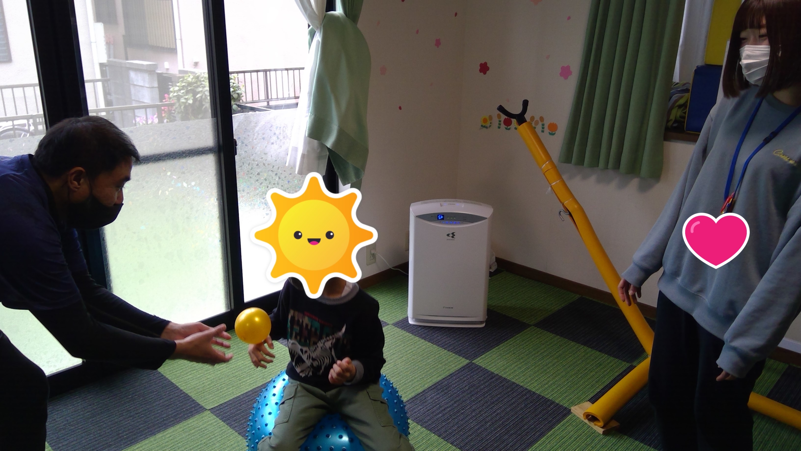 通常ですとボールを投げて遊ぶ療育ですが、お姉さんは、トランポリンを飛びながら手渡しをしてくれていました。