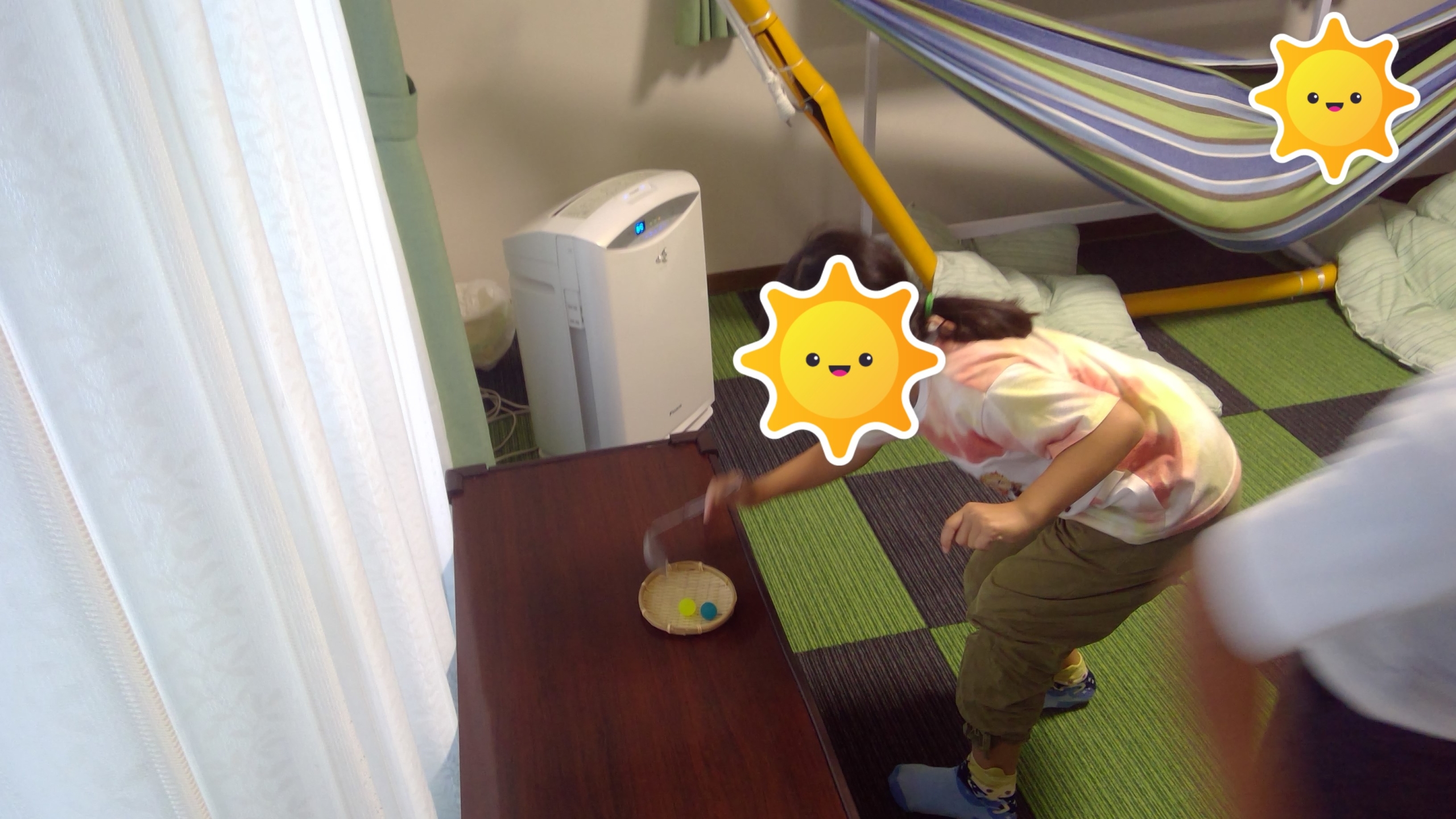 お皿の上でころころところがるボールをスプーン、お玉ですくいます。すくう際に手首や指先を使いながら落ち着いて行っていきます。