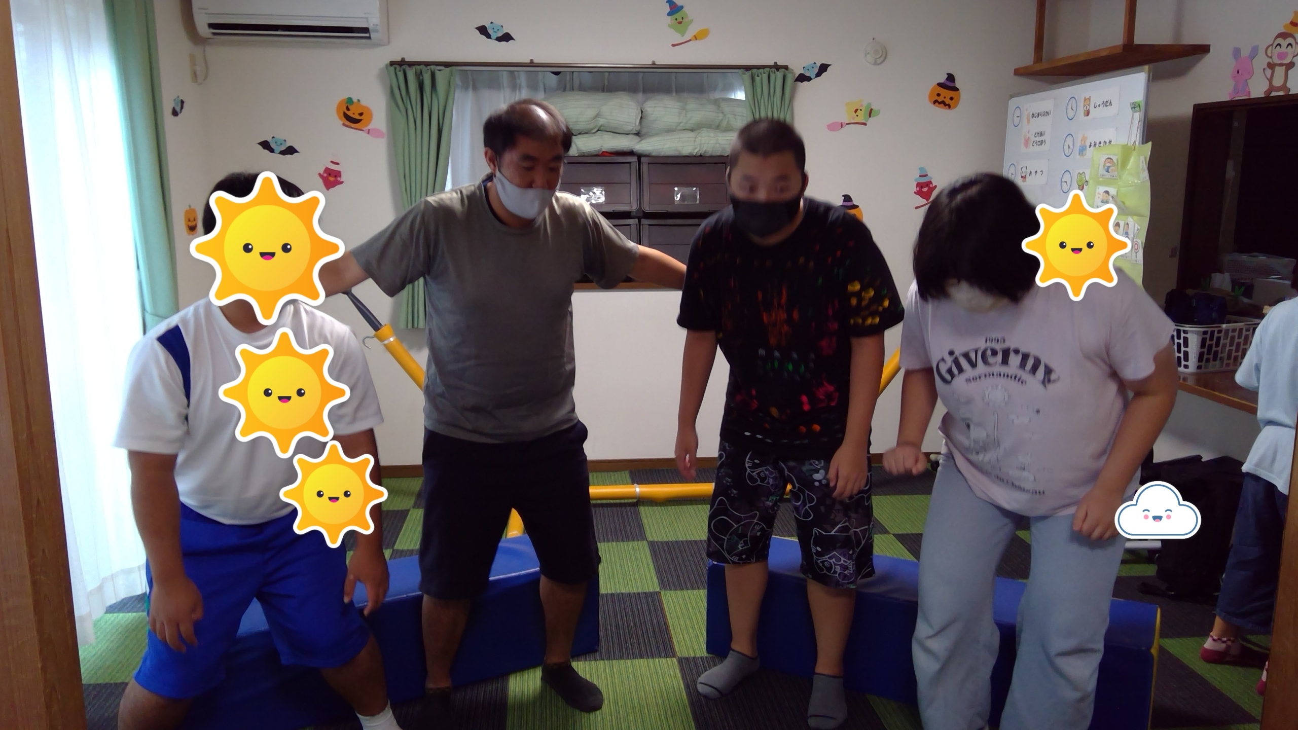 バランス感覚、平衡感覚を身に付け、不安定な足場の所でも真っすぐ歩く事の練習を行っています。