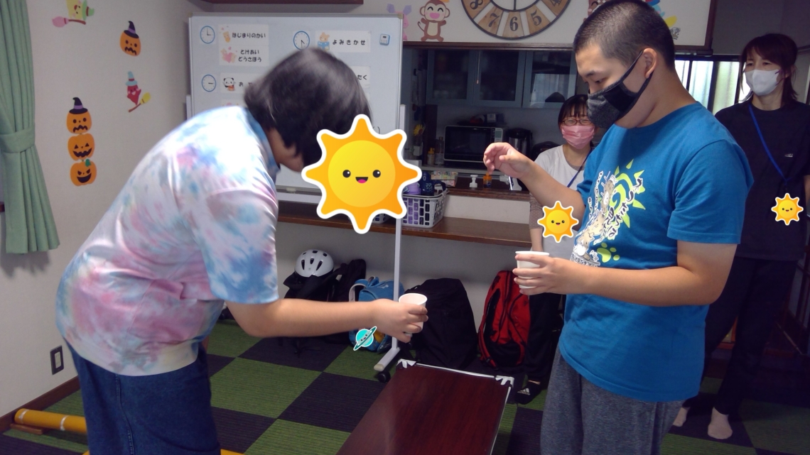 実際に職員もやってみると難しく、距離感をつかむために両目の必要性を実感しました。