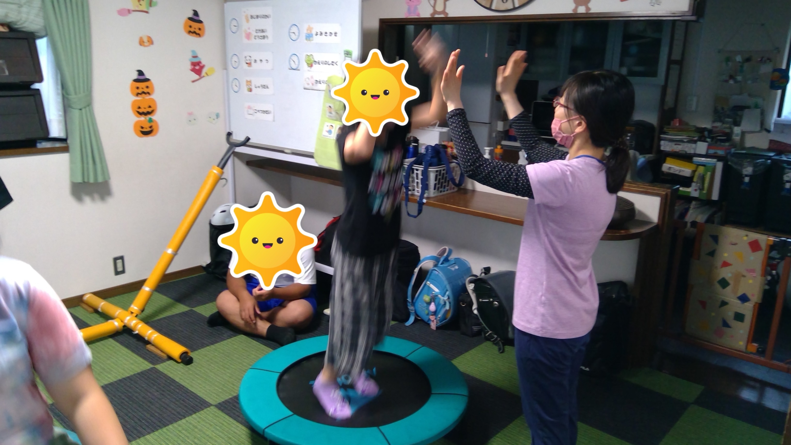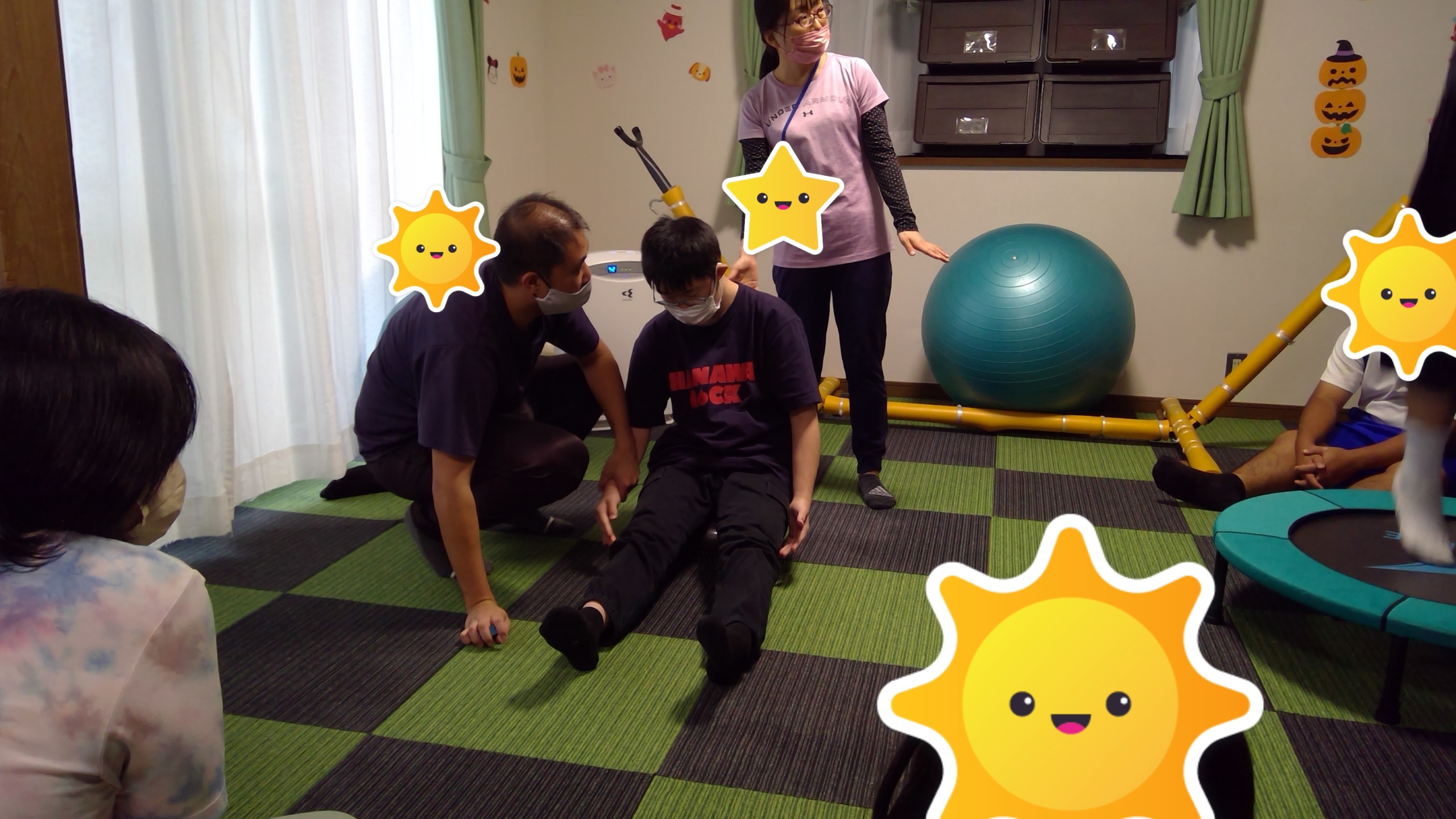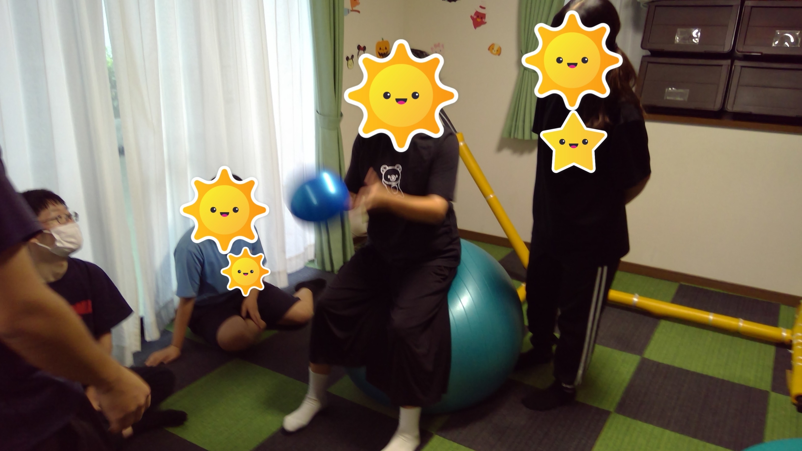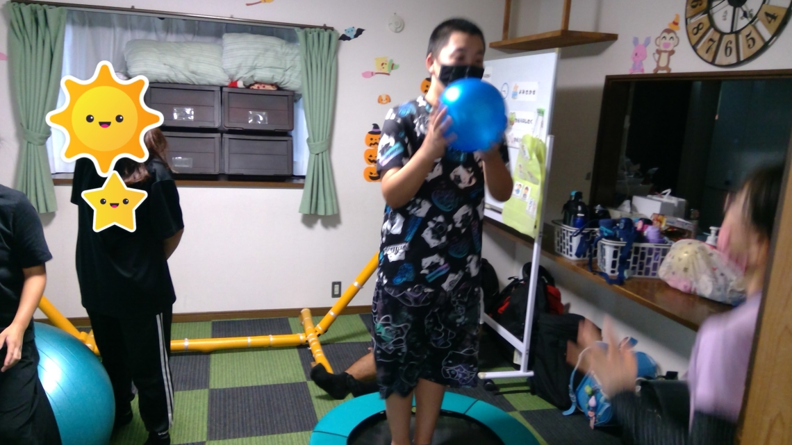台風も近づいているため、感覚統合遊びではバランスボールやトランポリンを行っています。