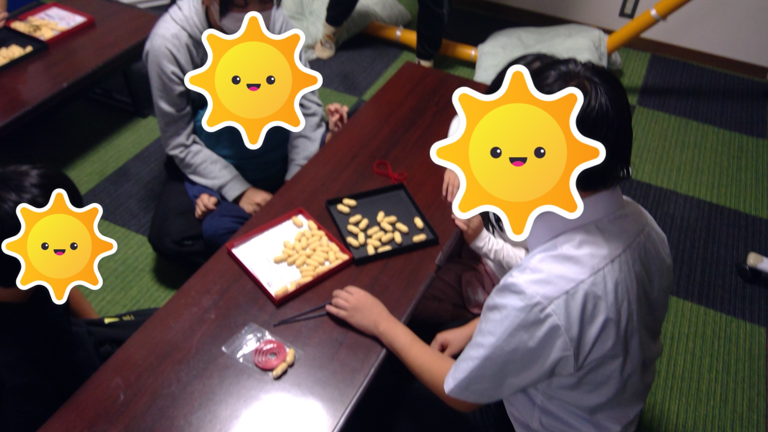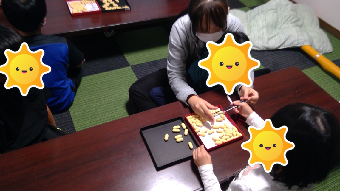お箸の練習使い方、持ち方の説明をしながら正しくお橋が使えるようにしながら食事のマナーについての説明も行っています。