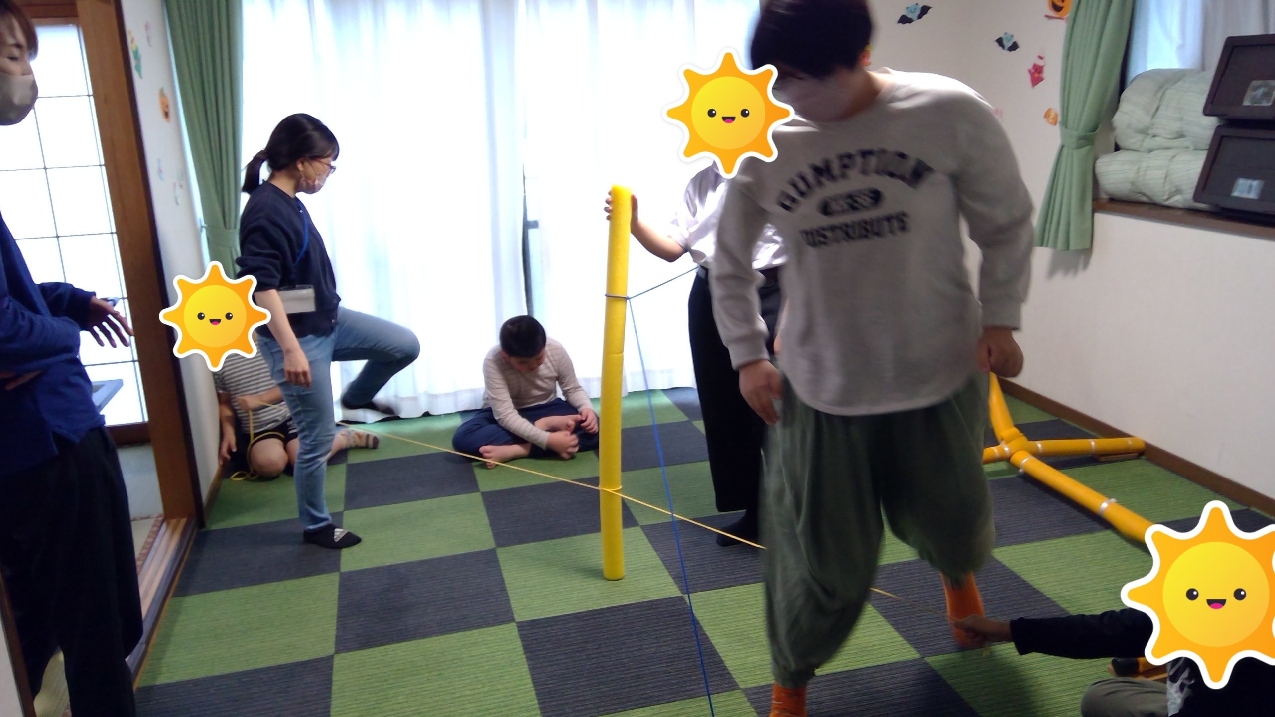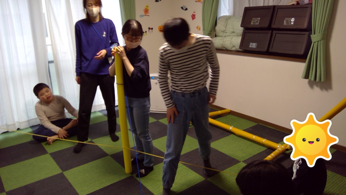 いろいろな高さに張り巡らされた紐に当たらないように、くぐったりまたいだり、
