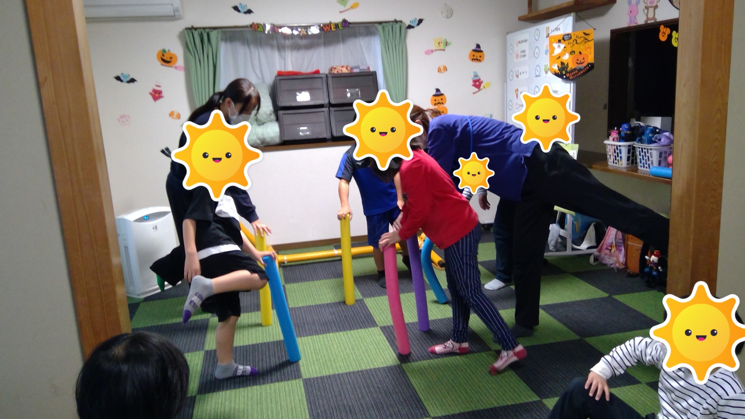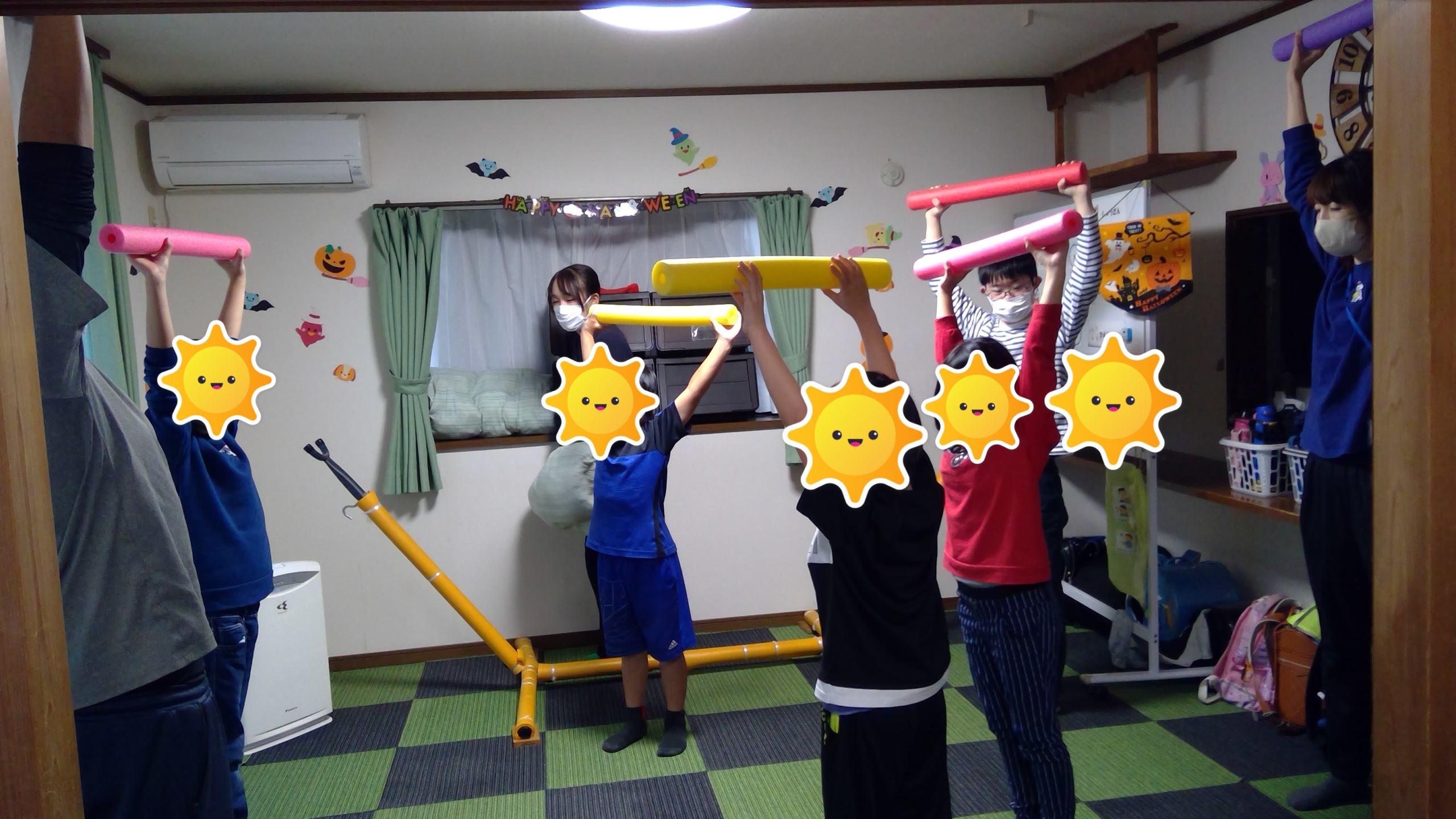 さて本日の集団活動は、プールスティックを使って、体幹を鍛える遊びを行いました。