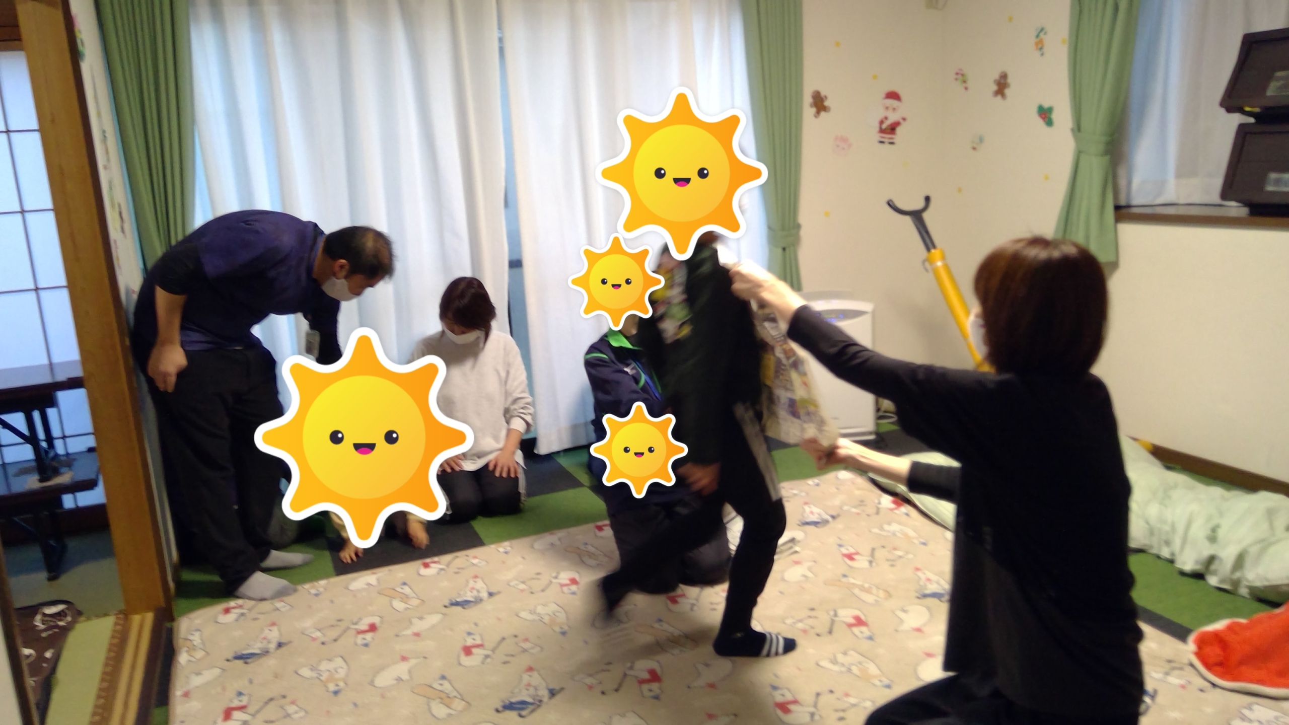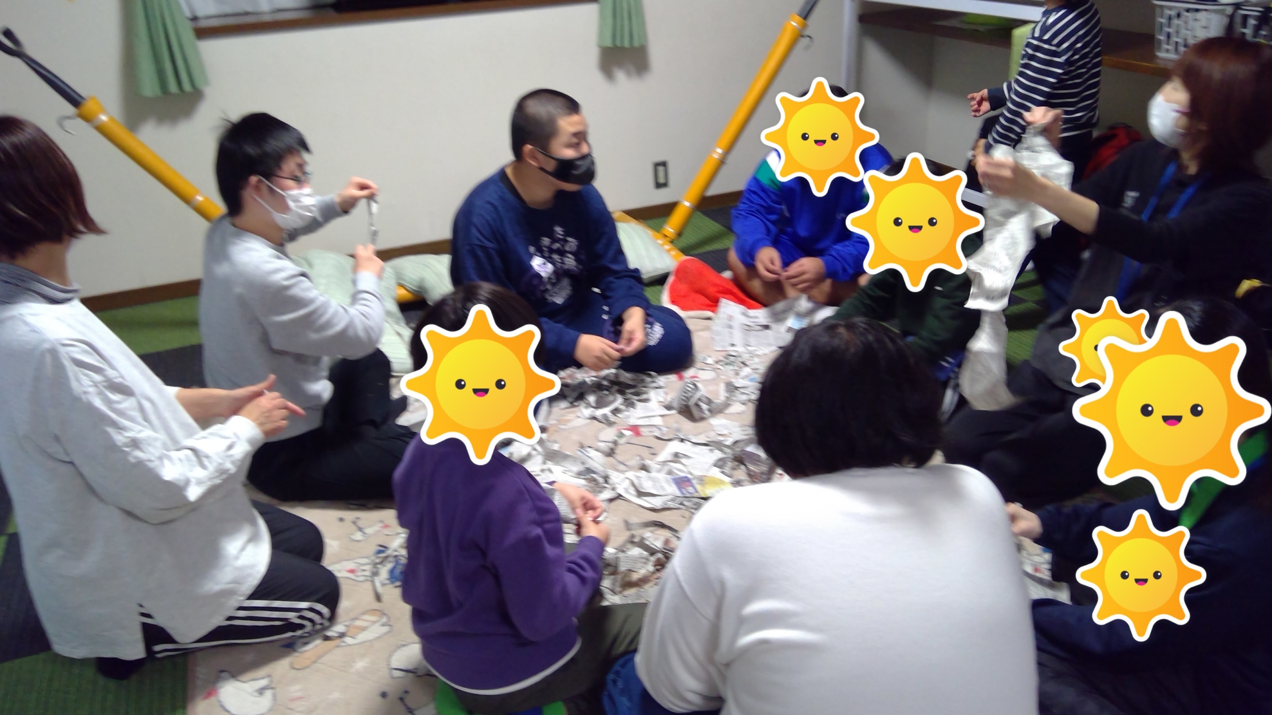 新聞をびりびり破りながら、手先や身体を使って楽しく行っています。