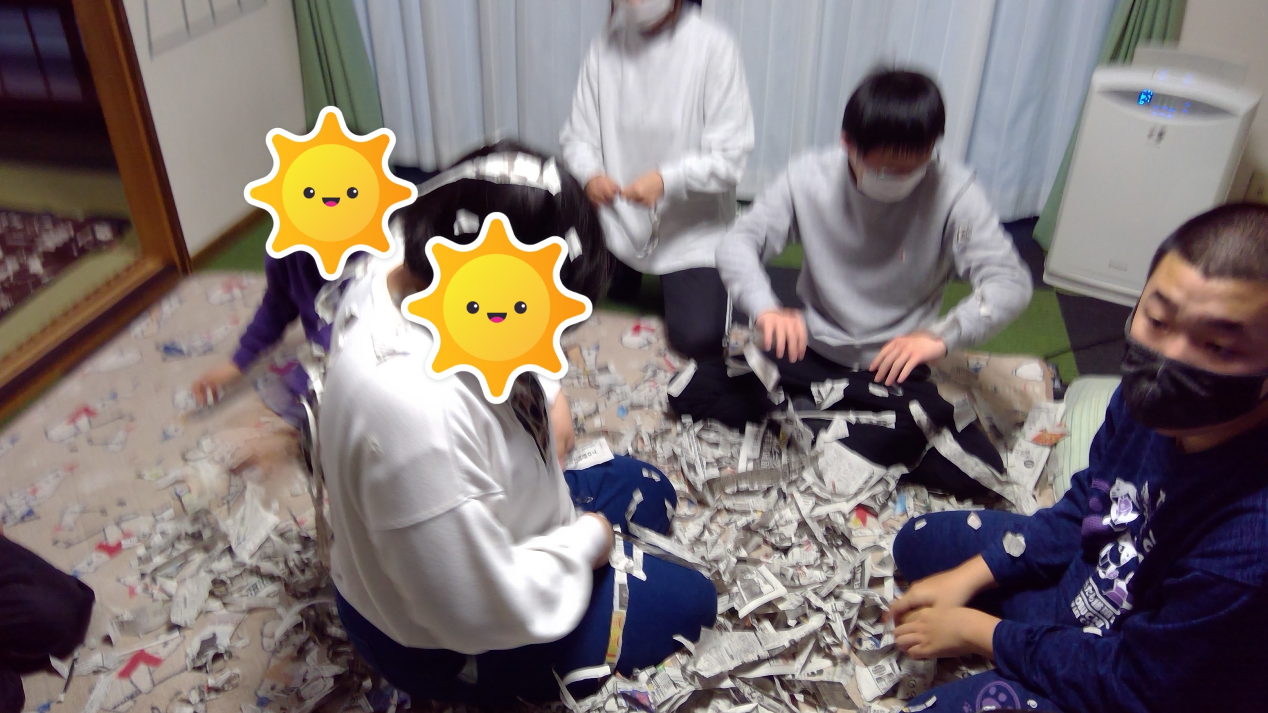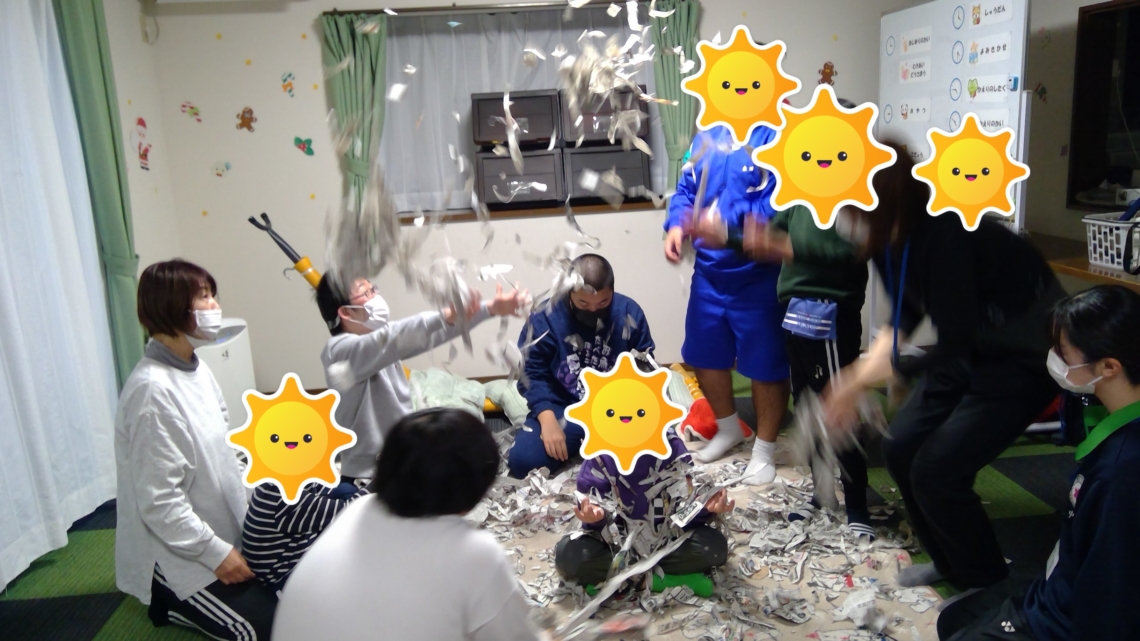 破いた新聞をみんなで掛け合いながら集団の一人としてみんな積極的に行っています。