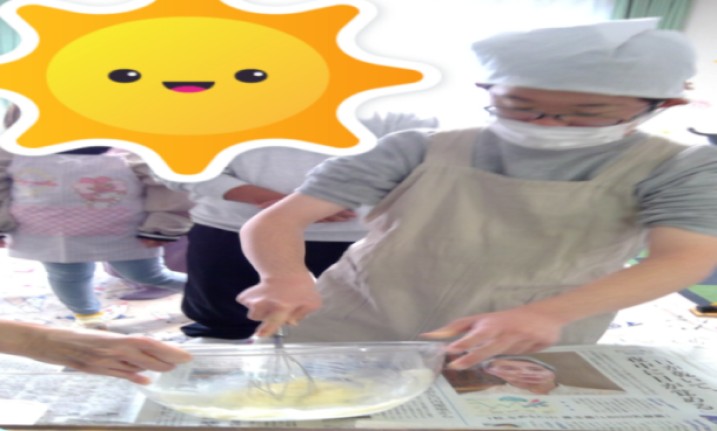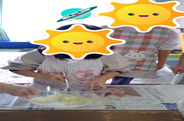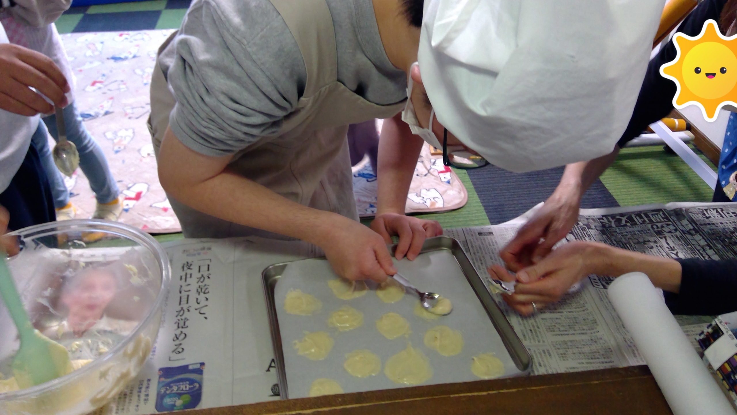 まず材料を計ったり、粉をふるったり混ぜたり、生地作り。出来上がった生地をクッキングシートの上で成型します。薄いもの、厚いもの、みんな上手に伸ばしてくれました。温まったオーブンに入れ焼きあがると、甘いにおいにニコニコです。