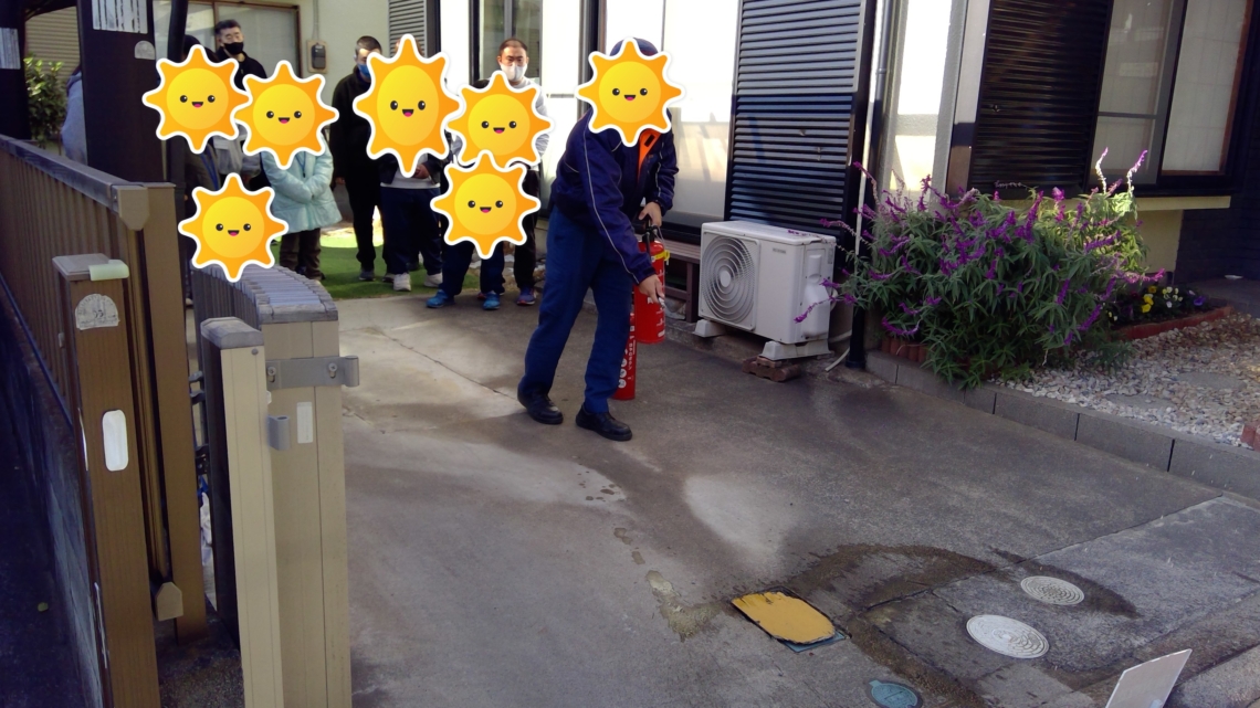 避難後は消火器の使い方の説明を受けながら実際に消火訓練を行いました。