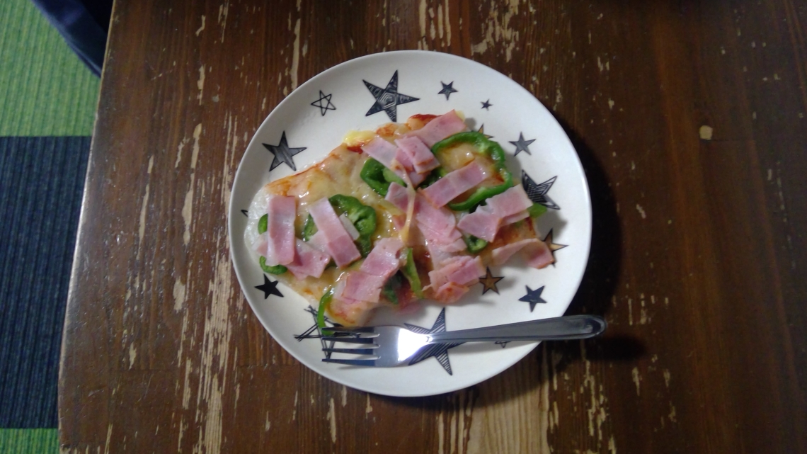 お餅を半分にスライスして焼き、火が通ったら、ピザソースを塗り、チーズ、ピーマン、ベーコンをトッピングして、チーズが溶けたらできあがりです。