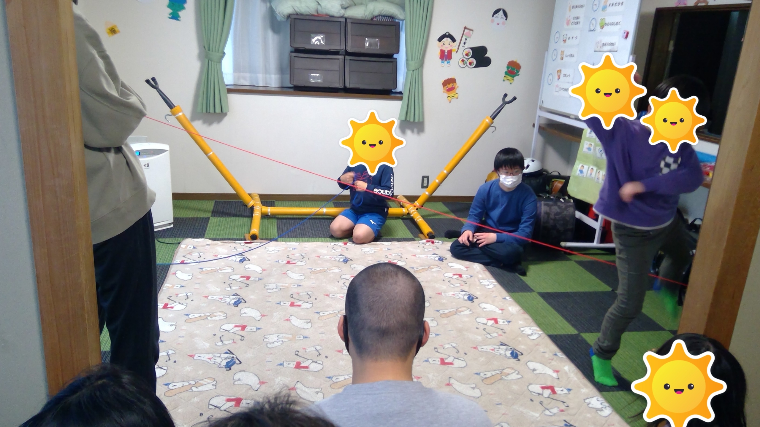 高さを見て、またぐべきか、くぐるべきか、自分で考え判断します。頭はくぐっても油断すると背中が紐に触れてしまうので、通り抜けるまで集中して行うように伝えています。