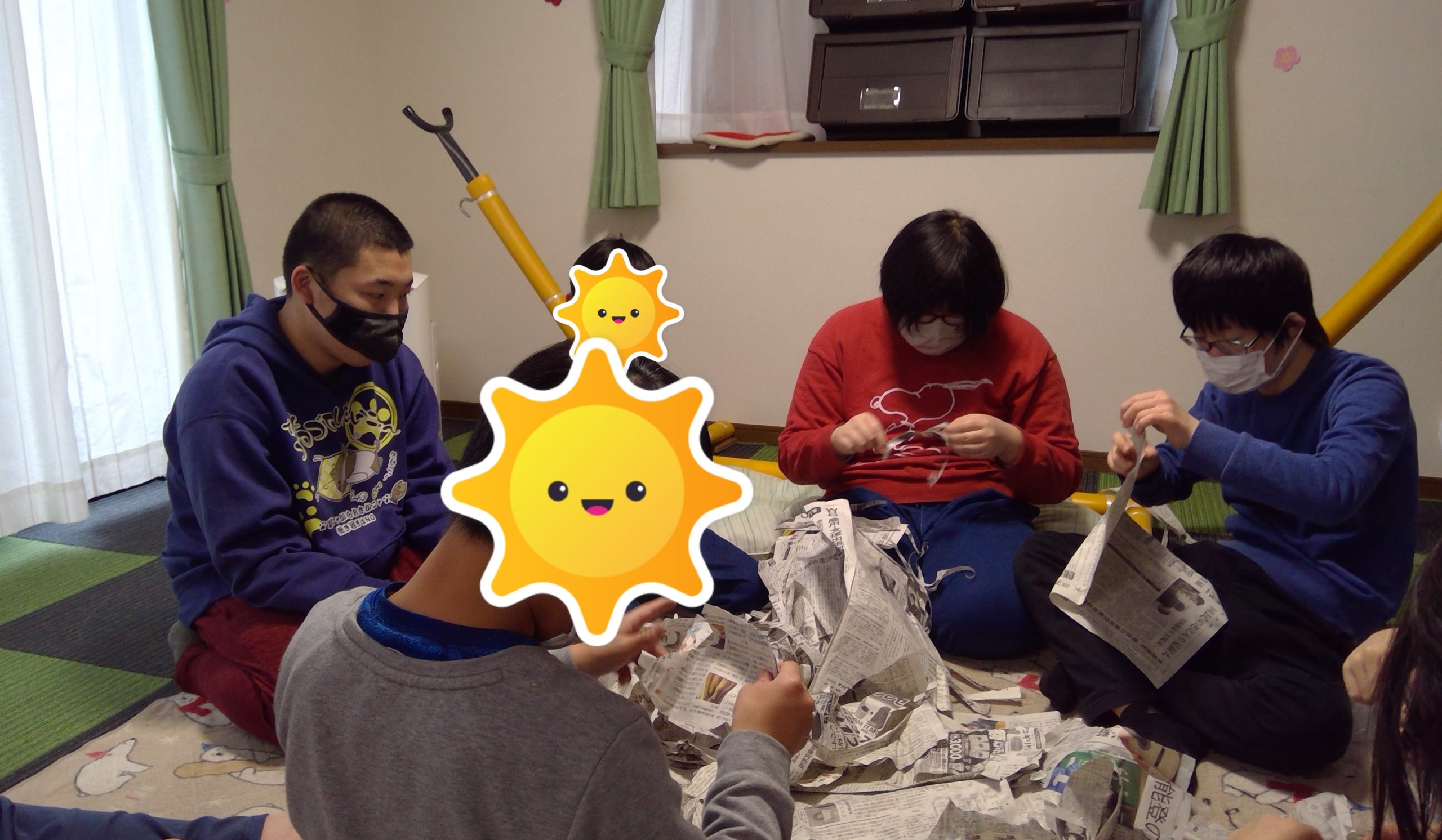 新聞を身体で体当たりして破いたり、指先を使ってちぎったり、感覚刺激を取り入れながら行いました。最後にはみんなで輪になり、真ん中のお友達は新聞をひらひらかけてもらい楽しみました。