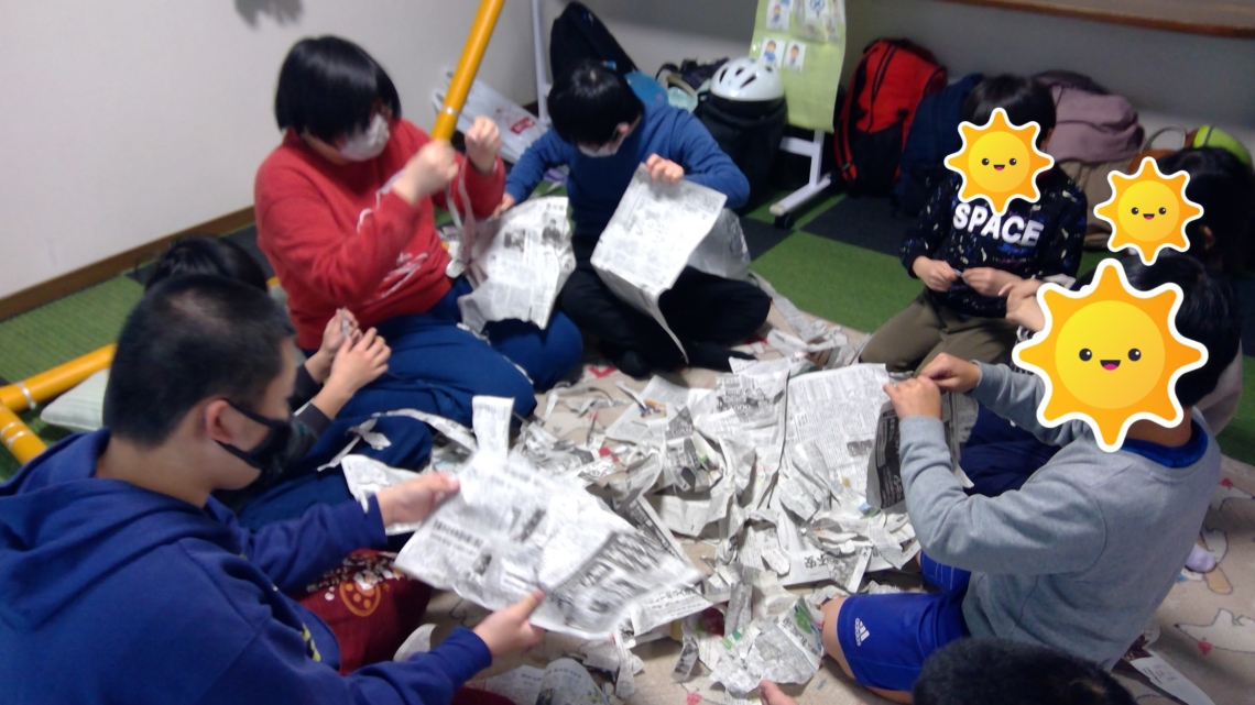 おやつを食べて一段落すると、今日は新聞破りの集団療育を行いました。