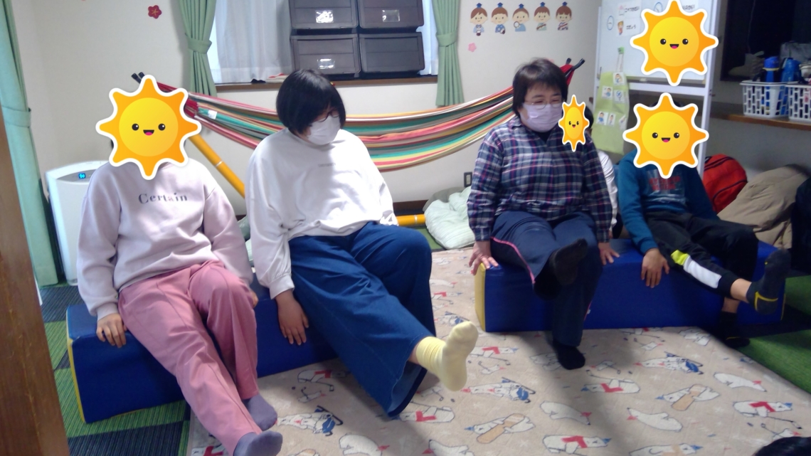 ゆっくり動くことの方が難しいこともあるため、職員の見本を見ながらみんなで楽しく体幹運動を行う事が出来ました。