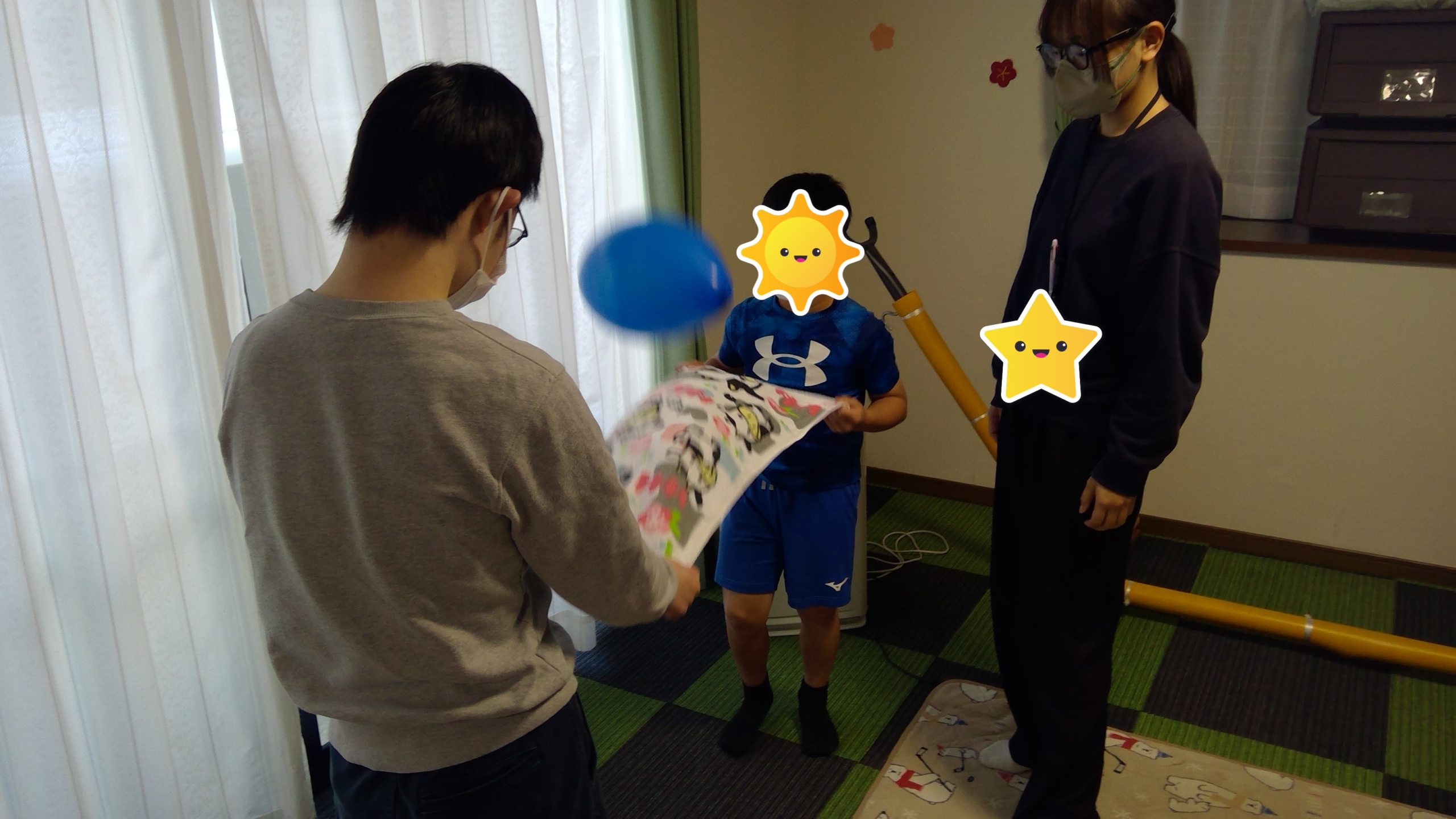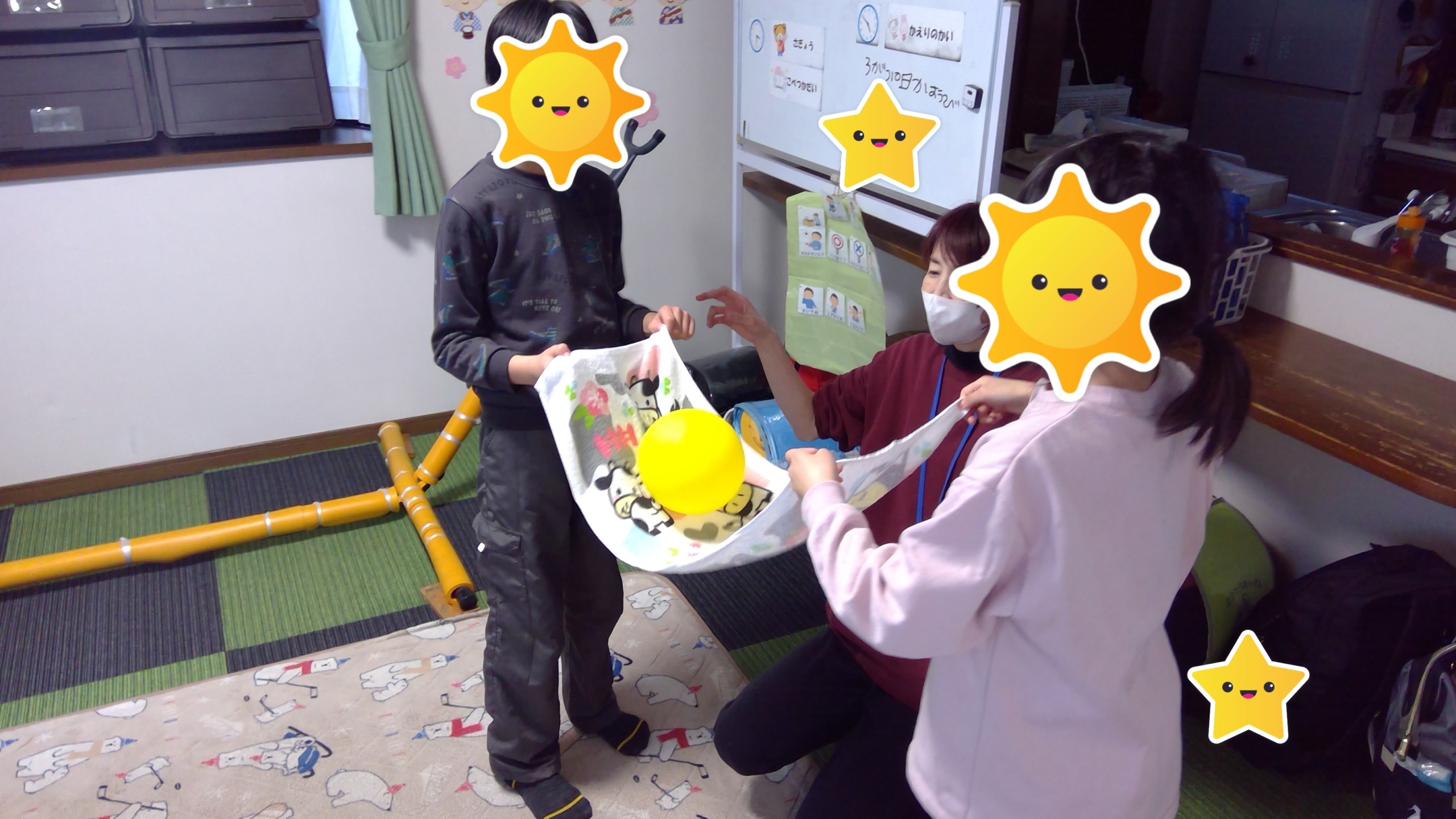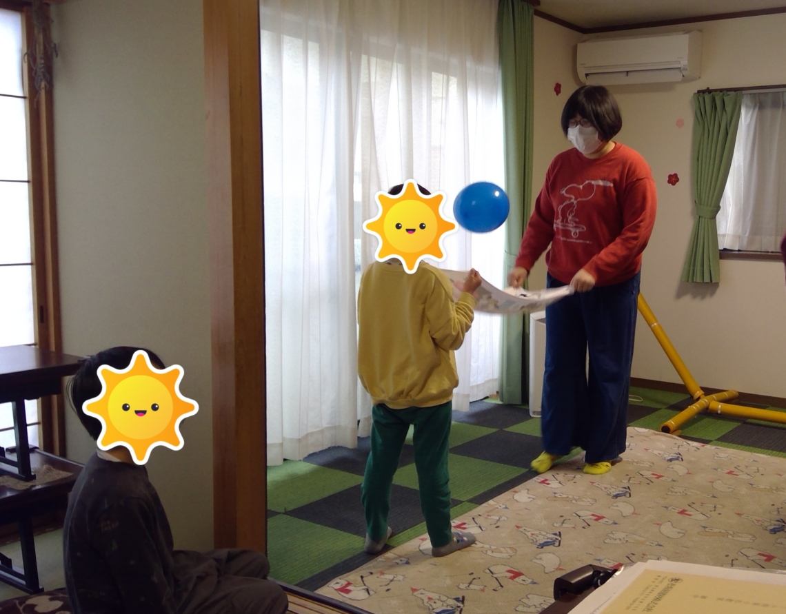 タオルを使い、お友達と息を合わせて風船を飛ばしたり、飛ばした風船をやさしくキャッチするなどお友達と協力しながら行っています。