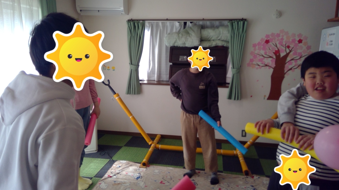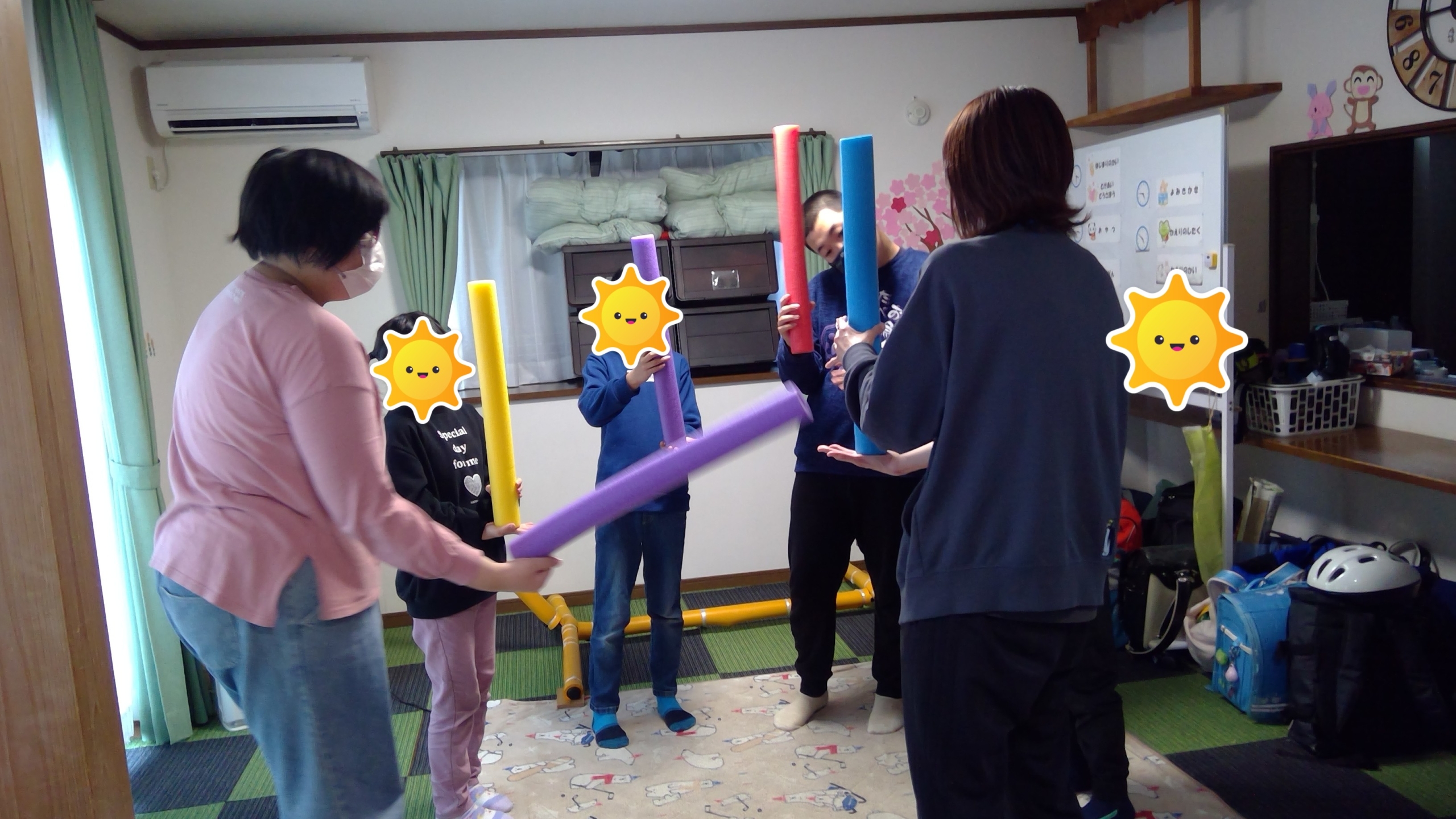 夕方からは体幹を鍛える活動を中心的に行い、プールスティックを使ってみんなで楽し遊ぶことが出来ました。