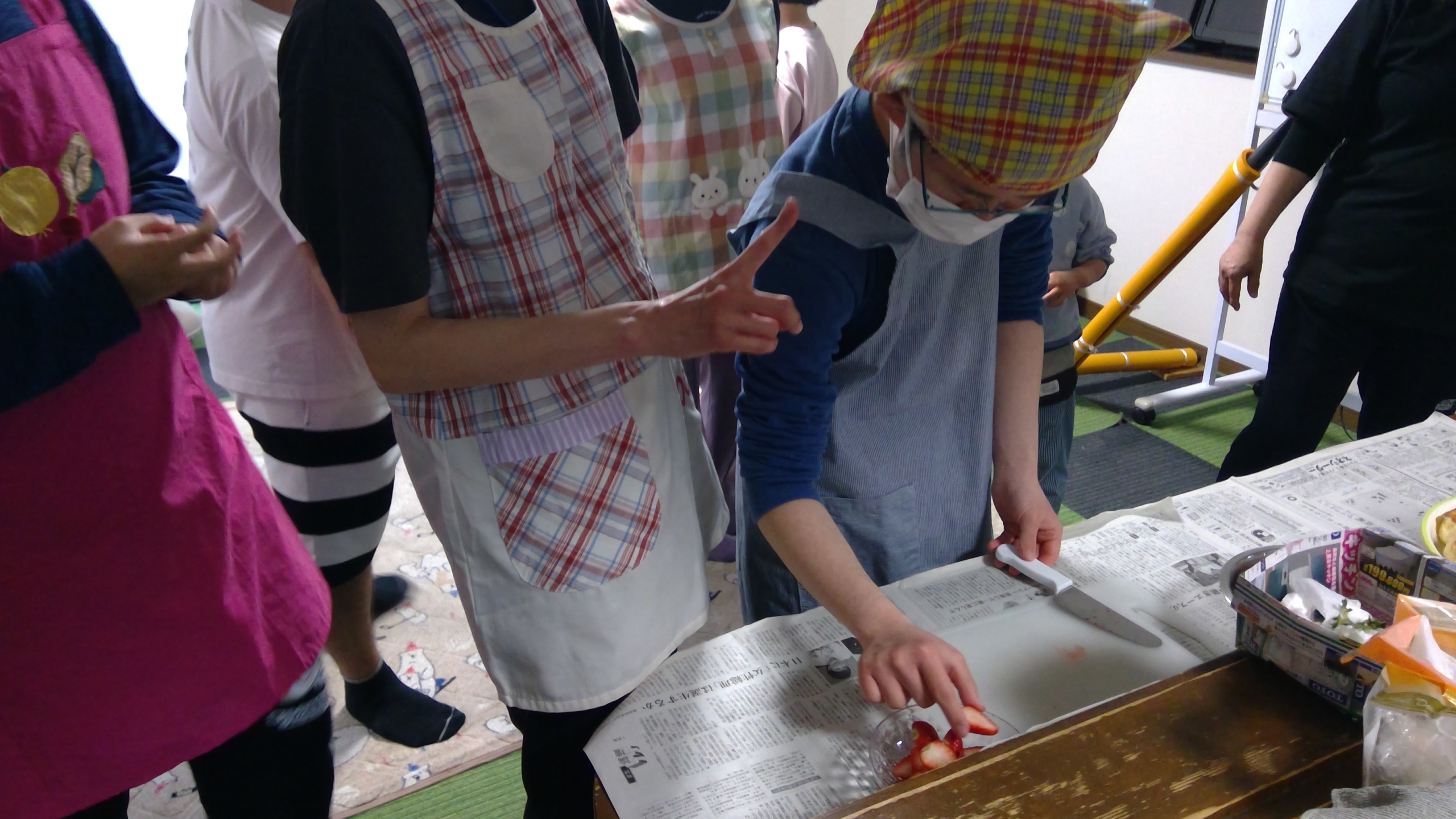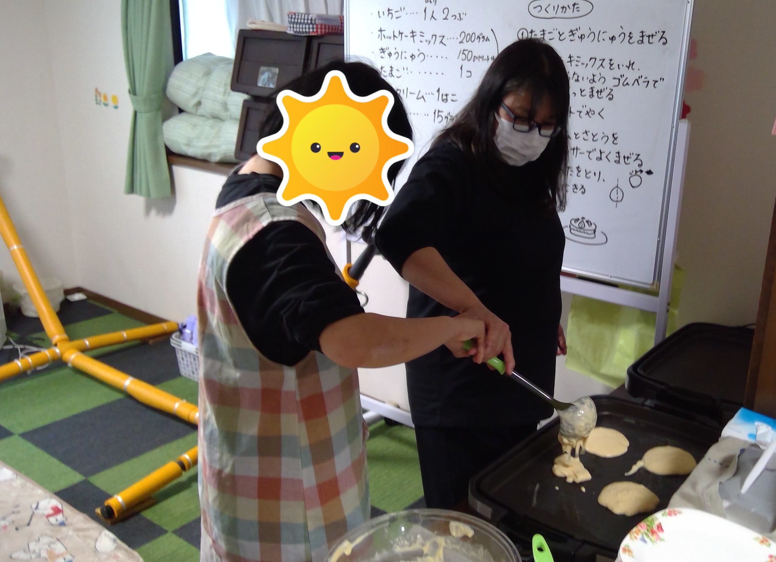 材料を計ったり、混ぜたり、やいたり、いろいろな工程を行います。卵の割り方、包丁の使い方も経験を重ねるごとに上手になっています。