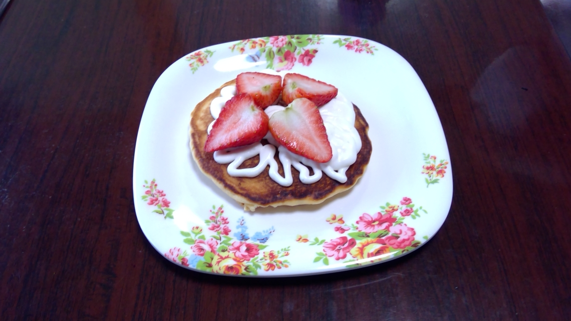 イチゴの美味しい季節、ホットケーキにイチゴと生クリームをトッピングして、スペシャルホットケーキを作ります。