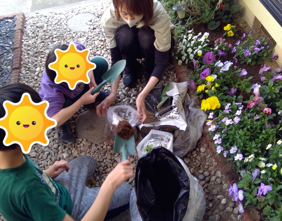 ジップロックを使ったお手軽家庭菜園です。竹串で袋の底に穴をあけ、シャベルで土を入れ、指であけた穴に種をまきました。いろいろな道具の使い方を確認しながら行っています。