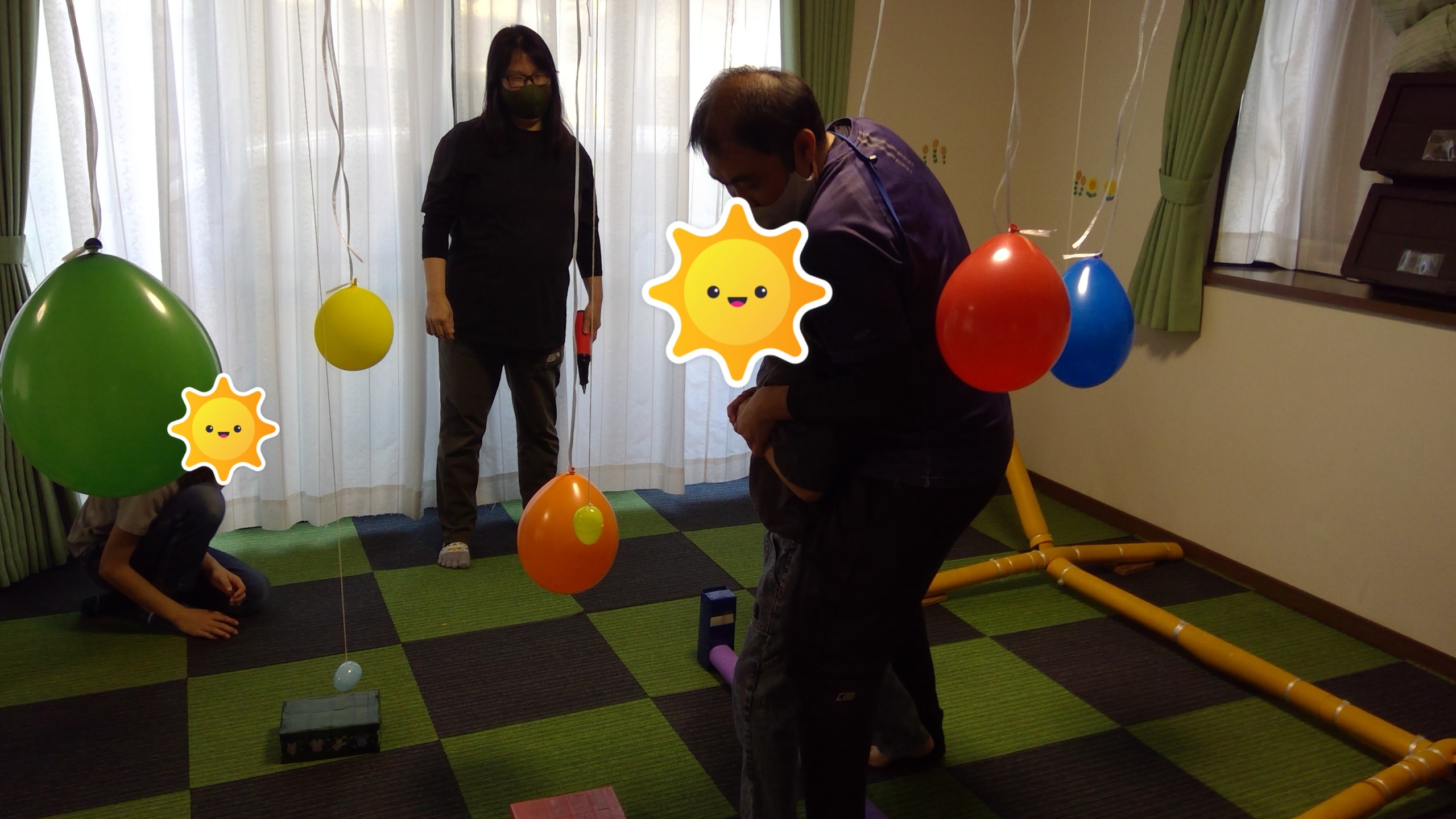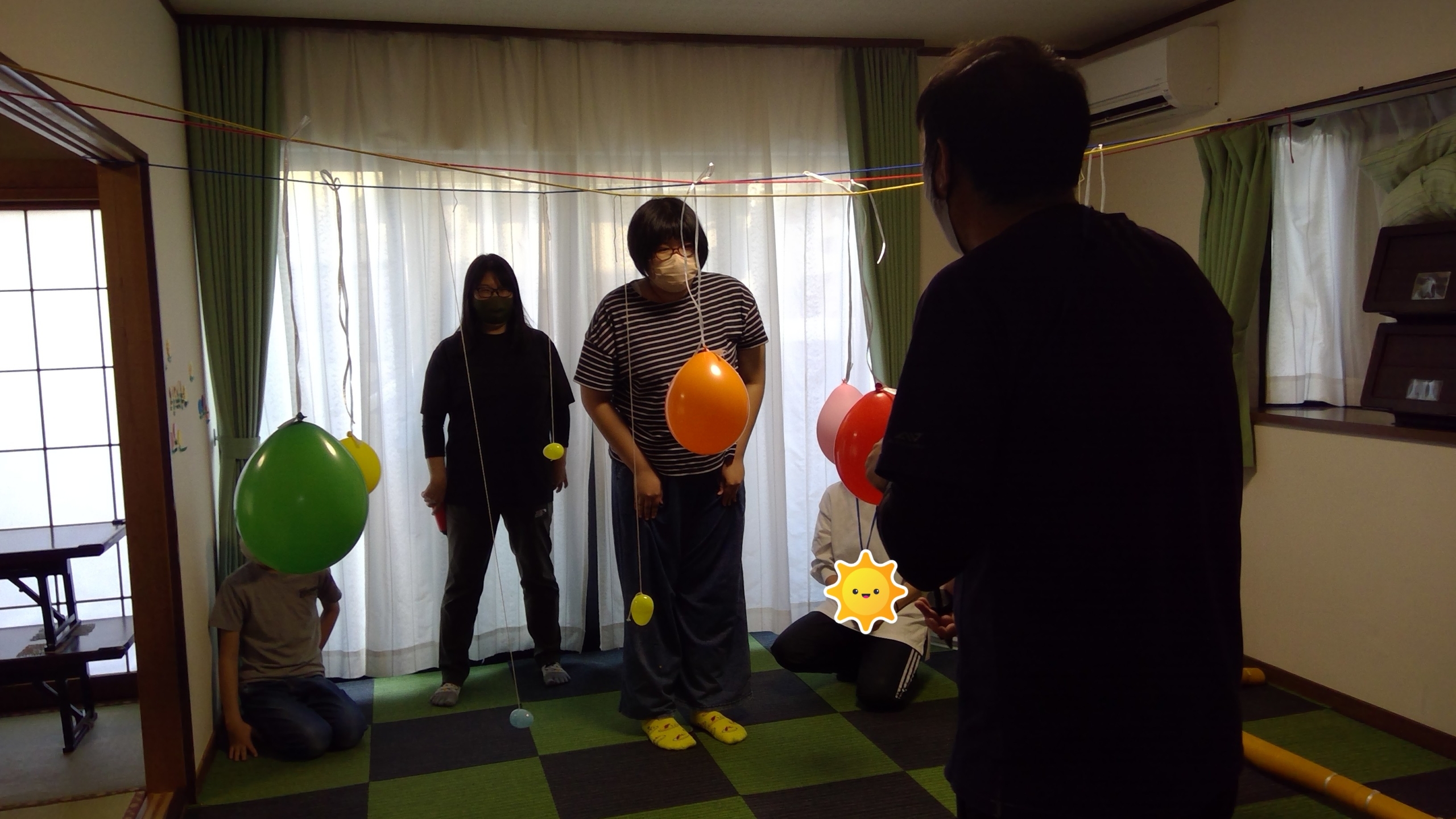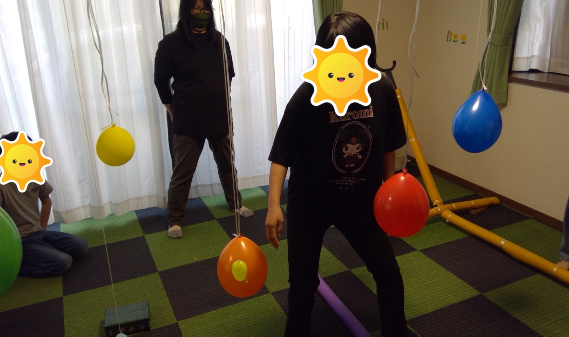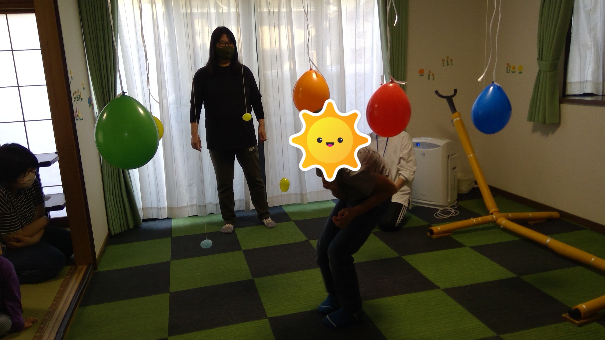 紐をつけた沢山の風船を教室内にぶら下げ、身体を低くしたり横向きになったりしながら、その間を紐や風船に触れないように通り抜けます。