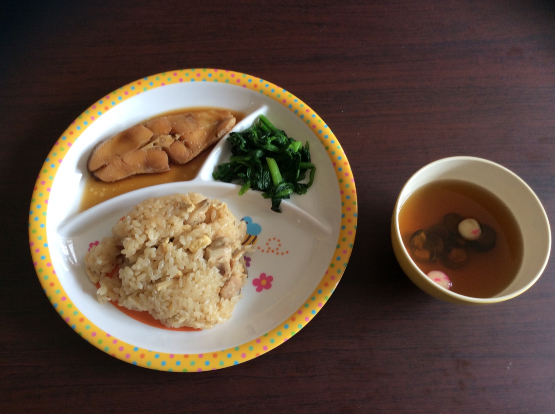 今日のメニューは、炊き込みご飯とカラスガレイの煮付け、ほうれん草のバター和え、しじみのすまし汁でした。