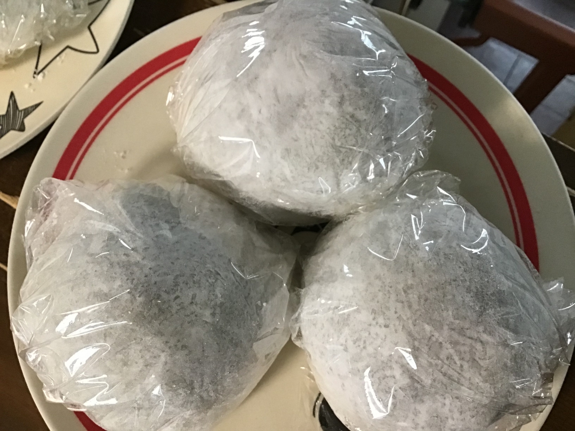 お餅をついて、つきたてのお餅を片栗粉で伸ばして、あんこと苺を包みました。